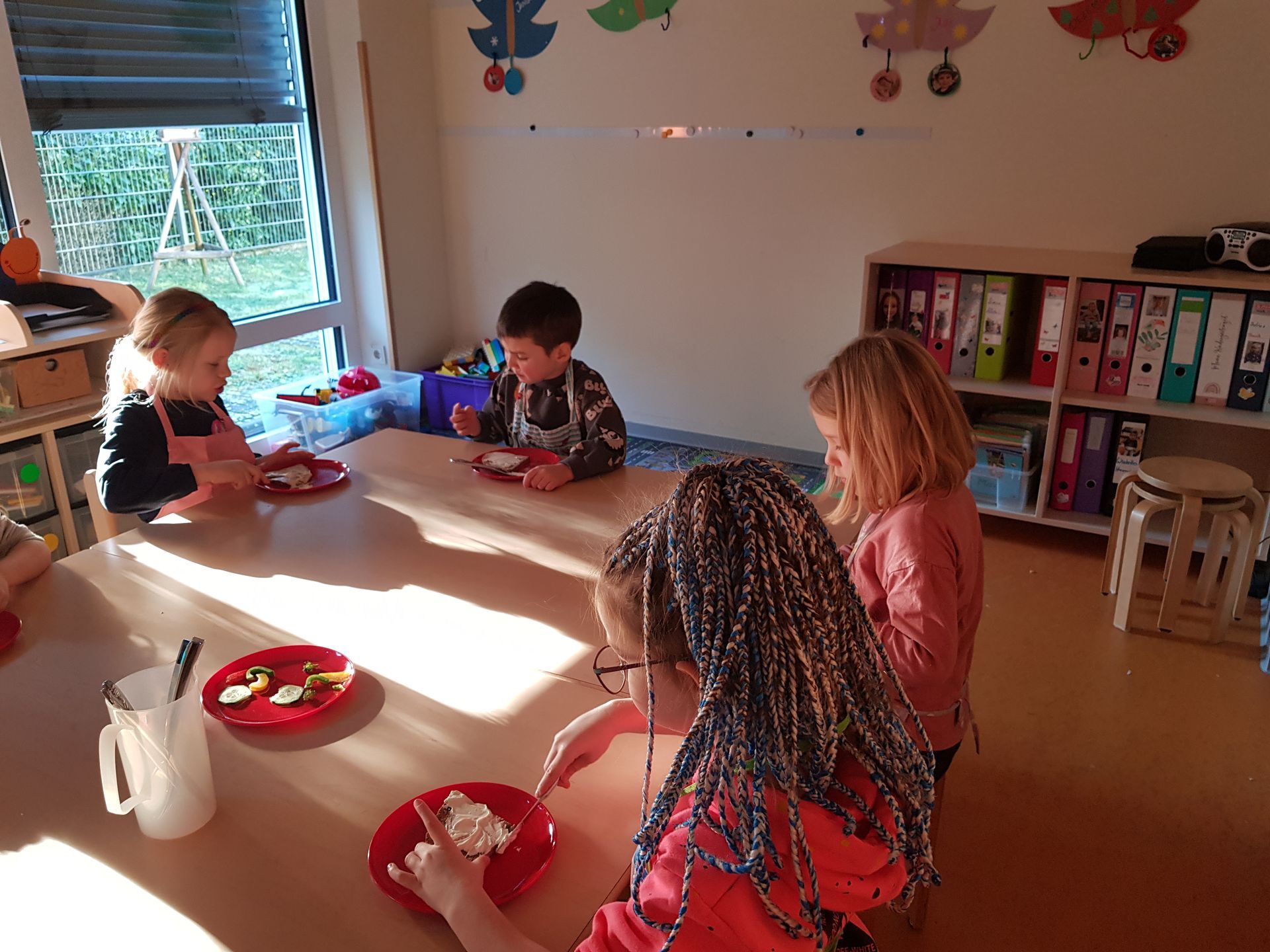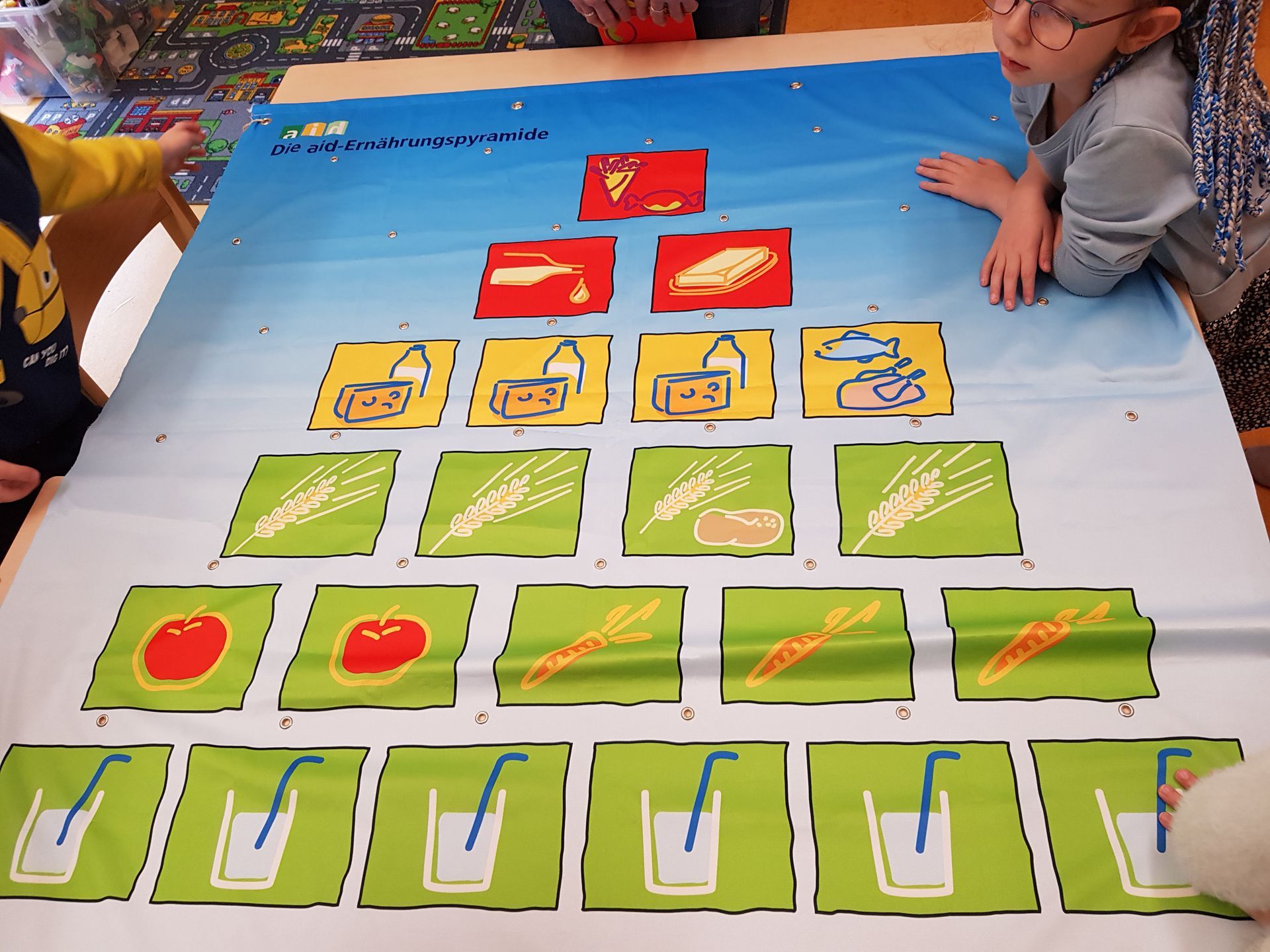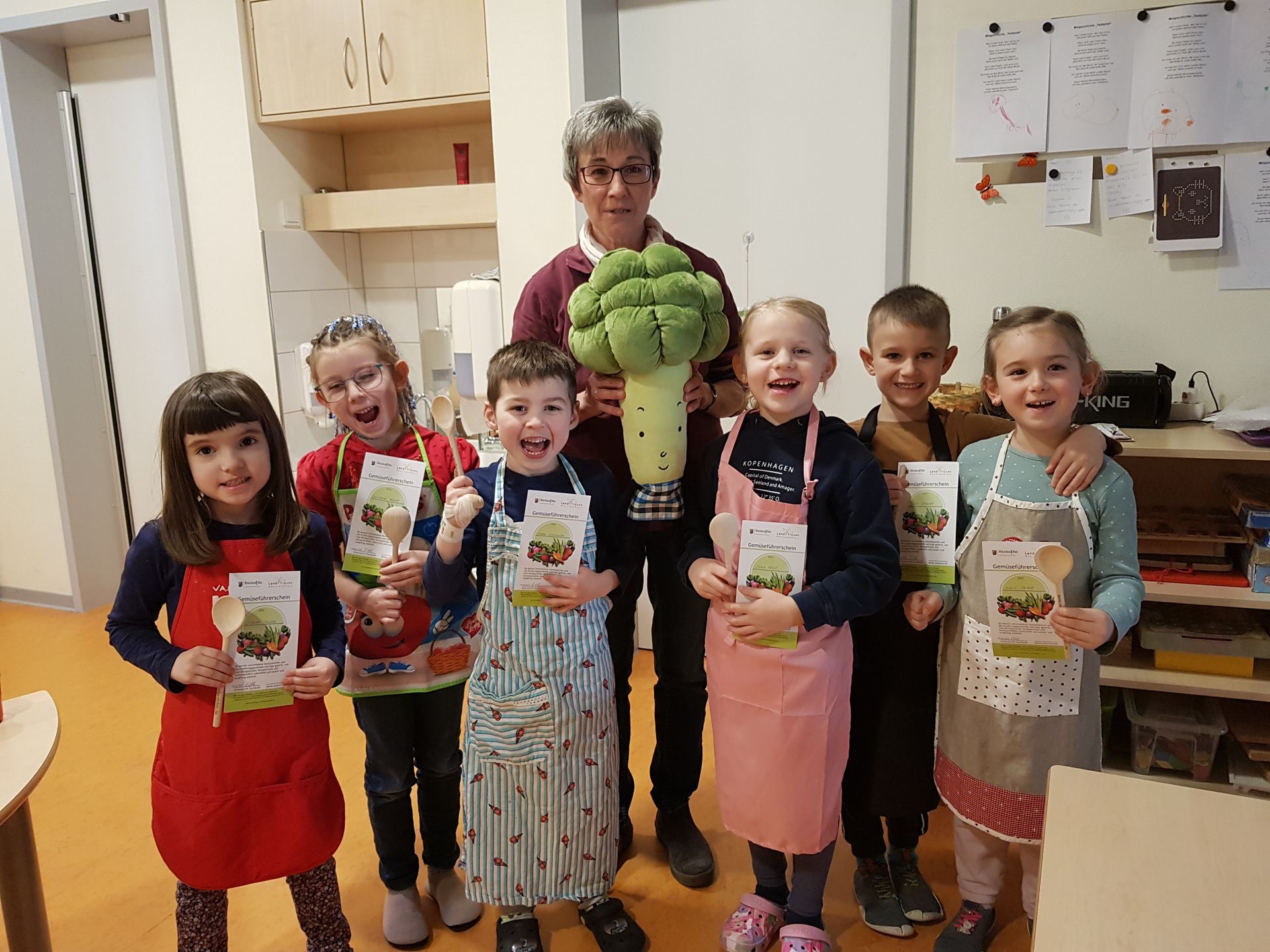 An 3 Nachmittagen erfuhren die Kinder was Hygienemaßnahmen sind, welche Lebensmittel gesund und ungesund sind, probierten verschiedene Gemüse- und Obstsorten, lernten die Lebensmittelpyramide kennen, bastelten einen Obst- und Gemüse-Schieber und hörten Geschichten von dem Gemüsekobold Bert.
