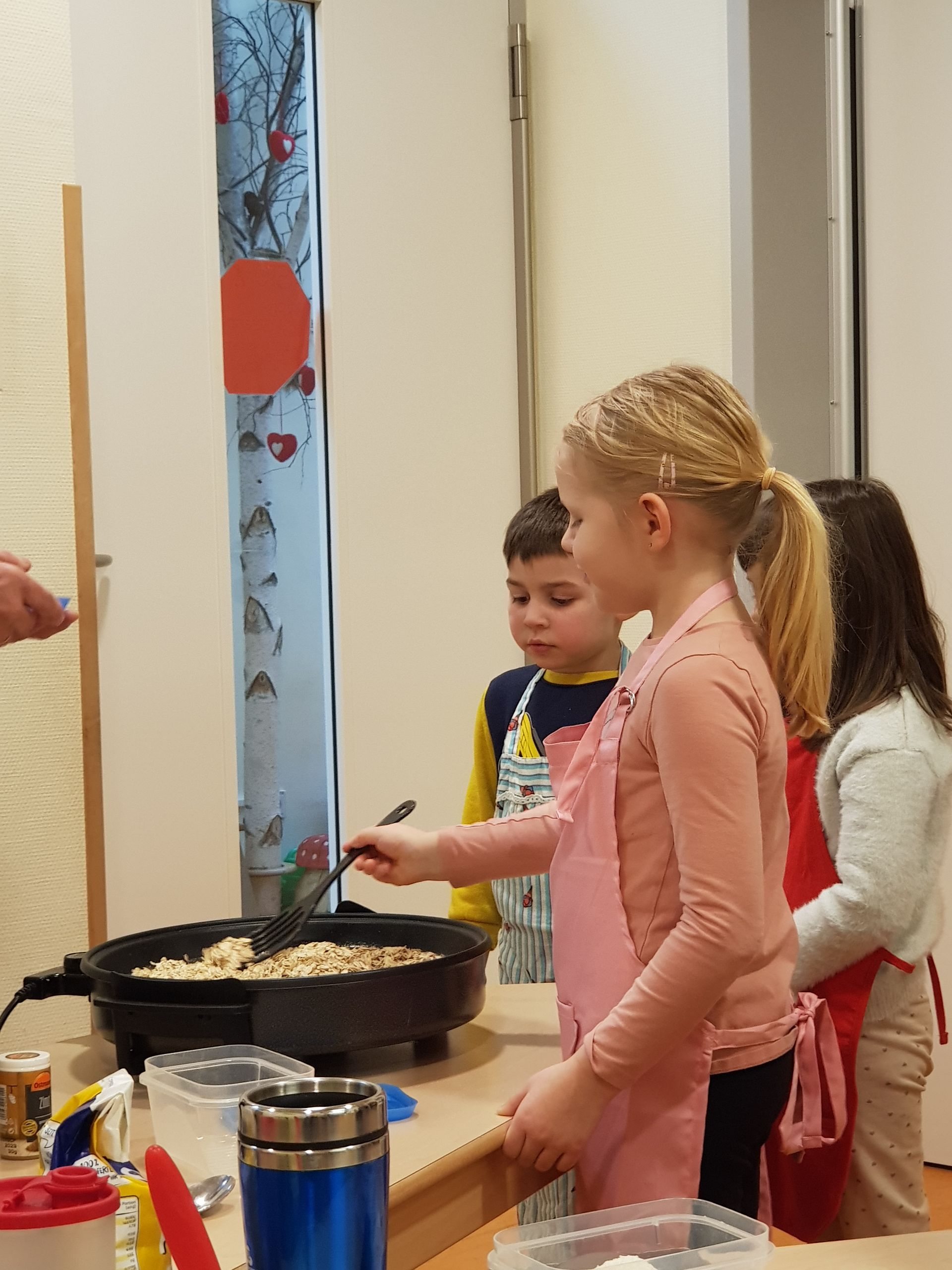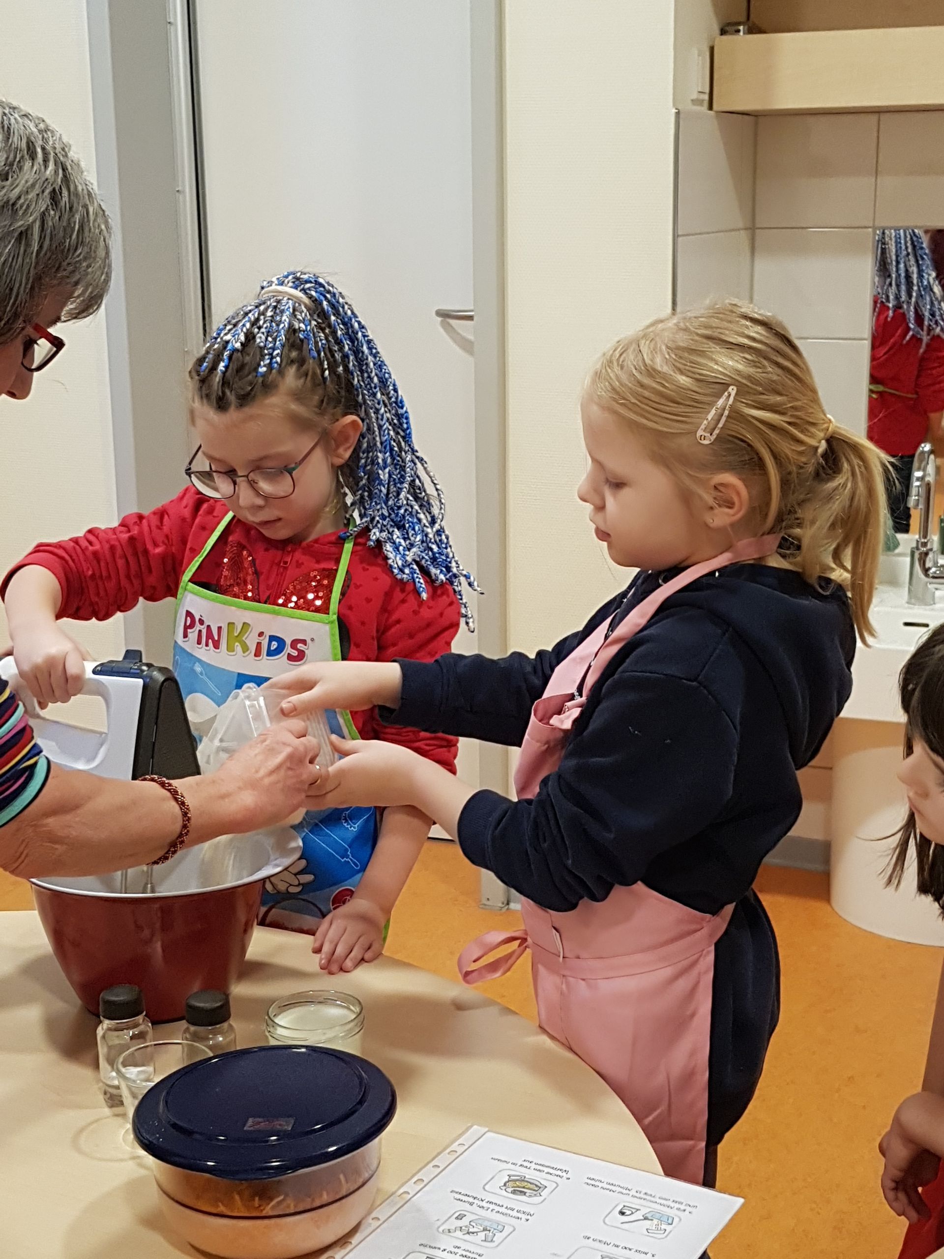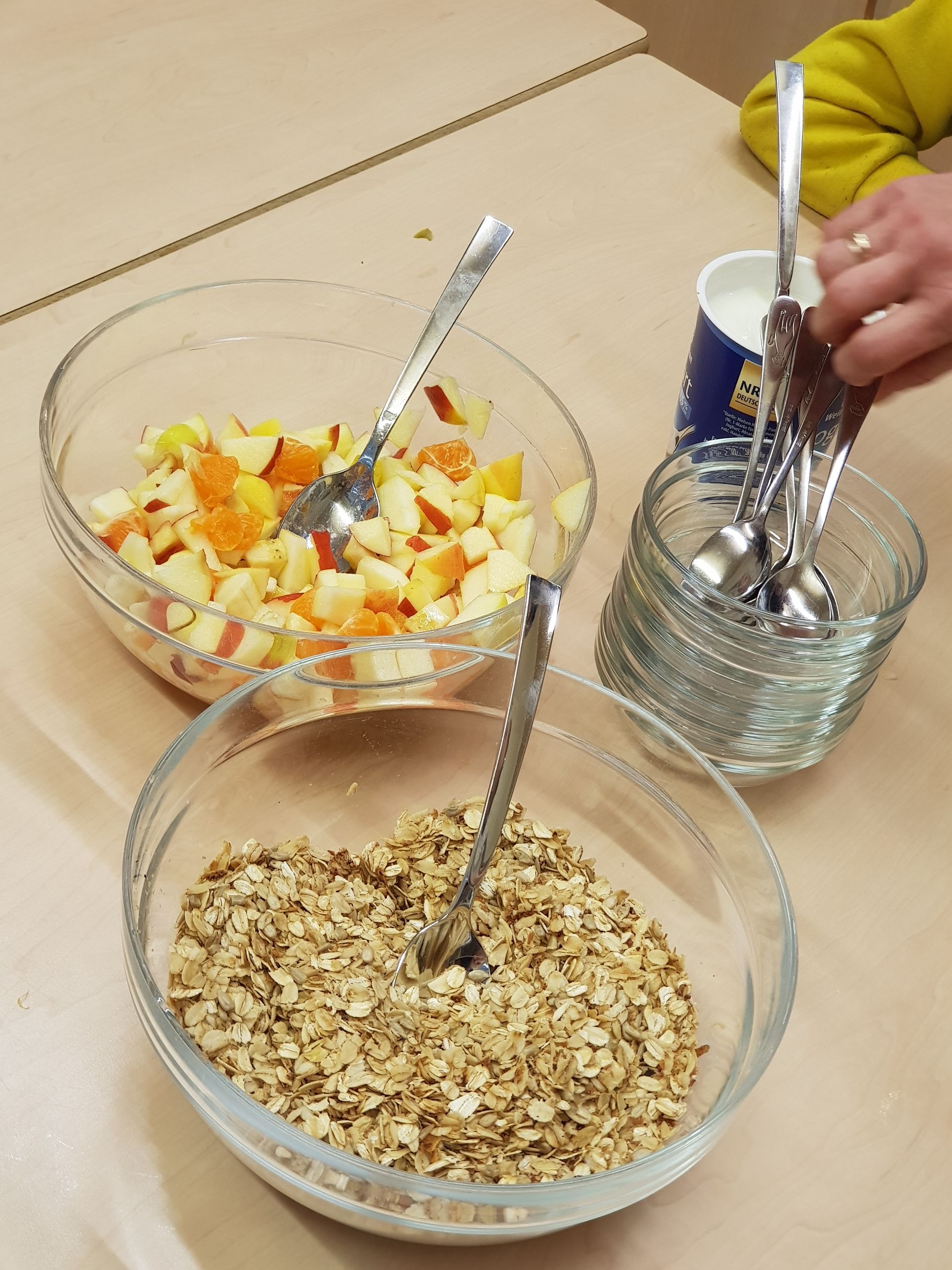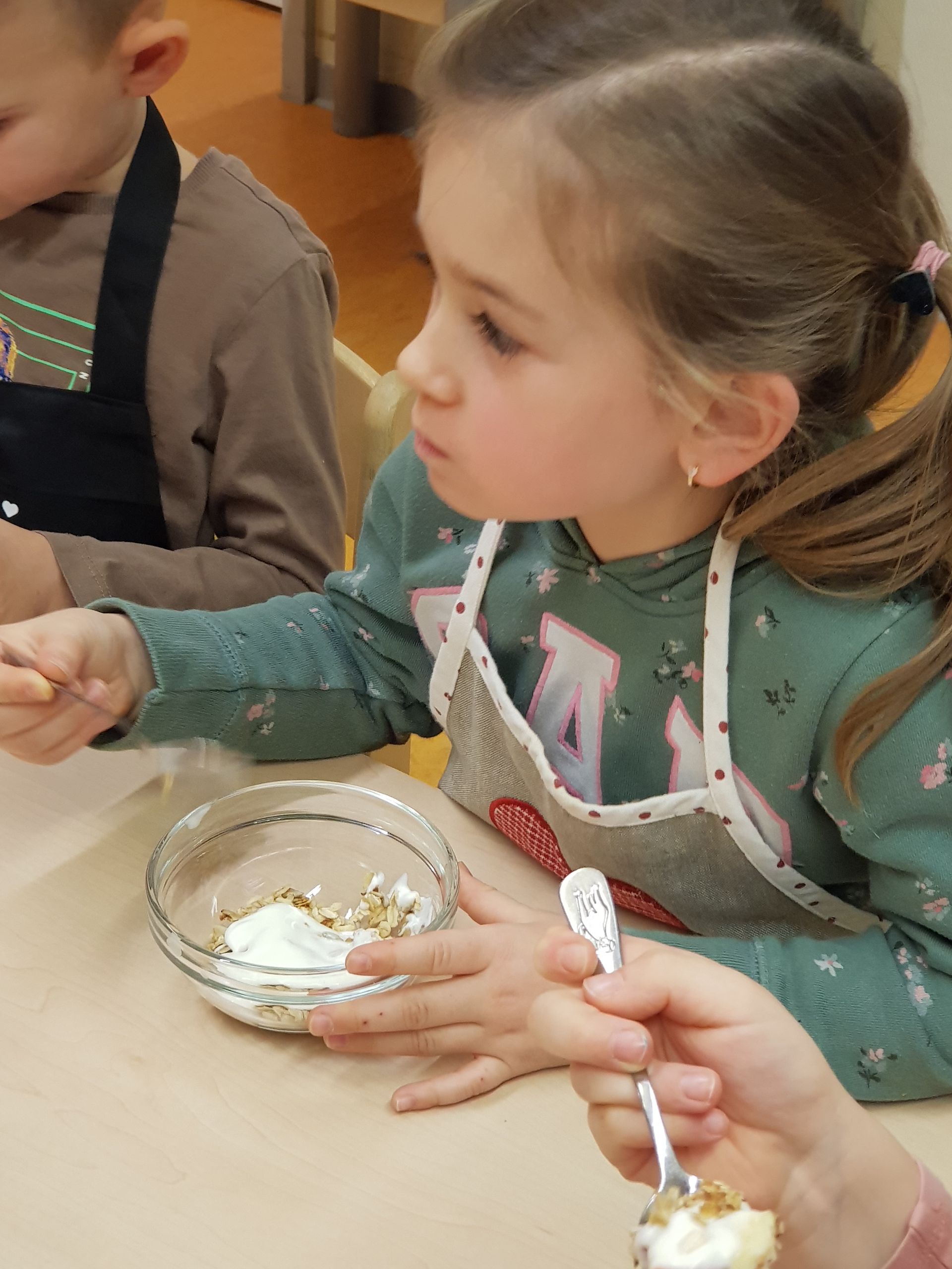 An 3 Nachmittagen erfuhren die Kinder was Hygienemaßnahmen sind, welche Lebensmittel gesund und ungesund sind, probierten verschiedene Gemüse- und Obstsorten, lernten die Lebensmittelpyramide kennen, bastelten einen Obst- und Gemüse-Schieber und hörten Geschichten von dem Gemüsekobold Bert.