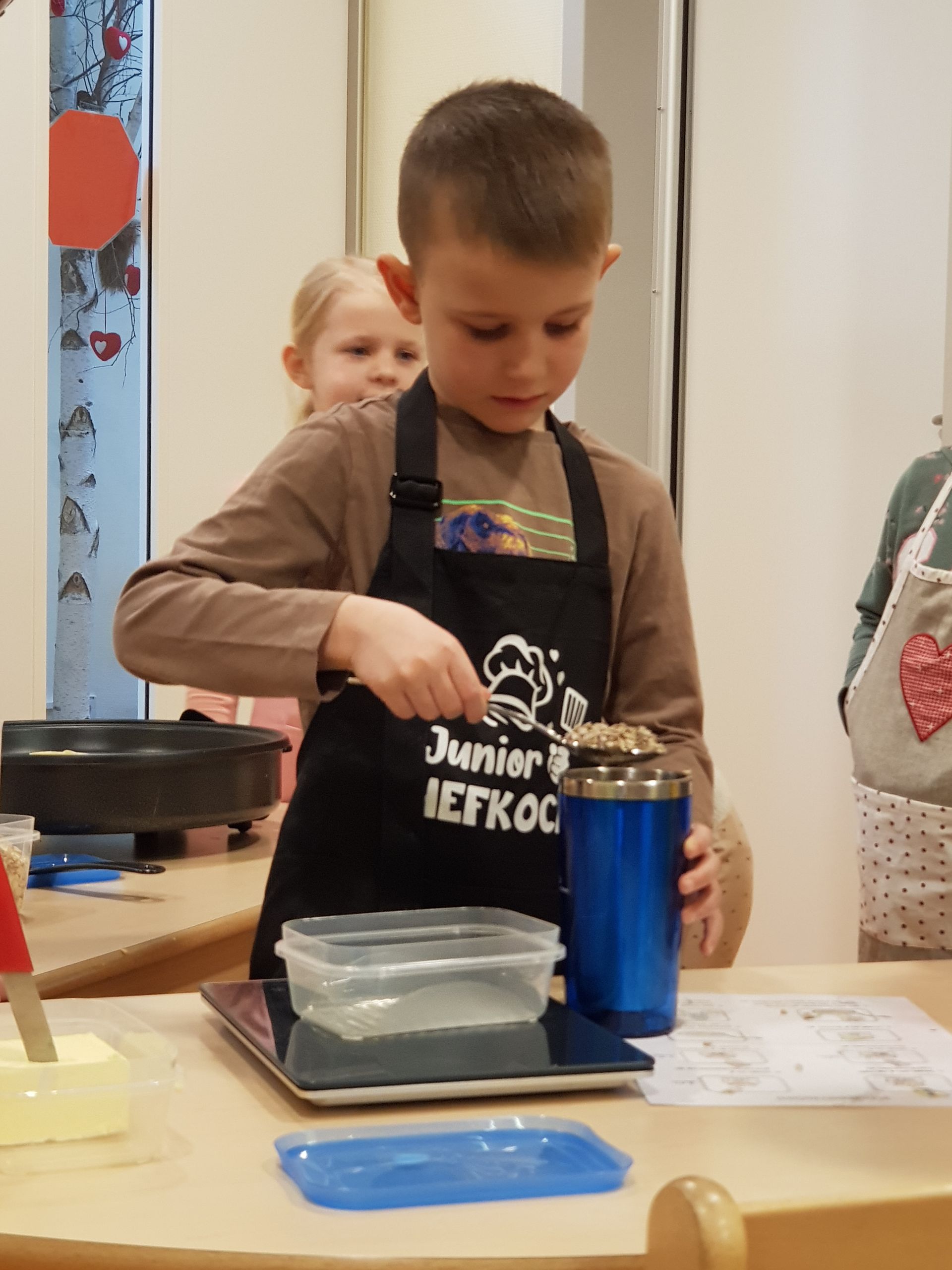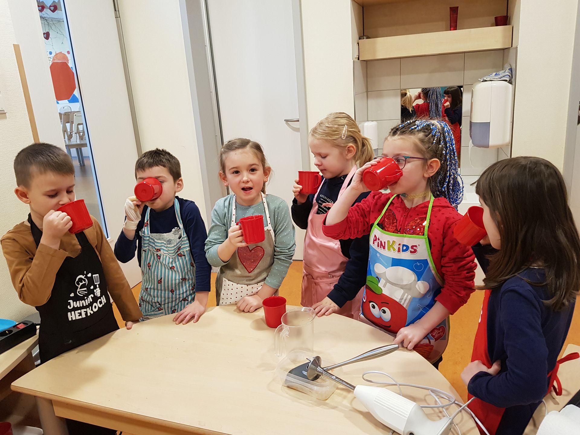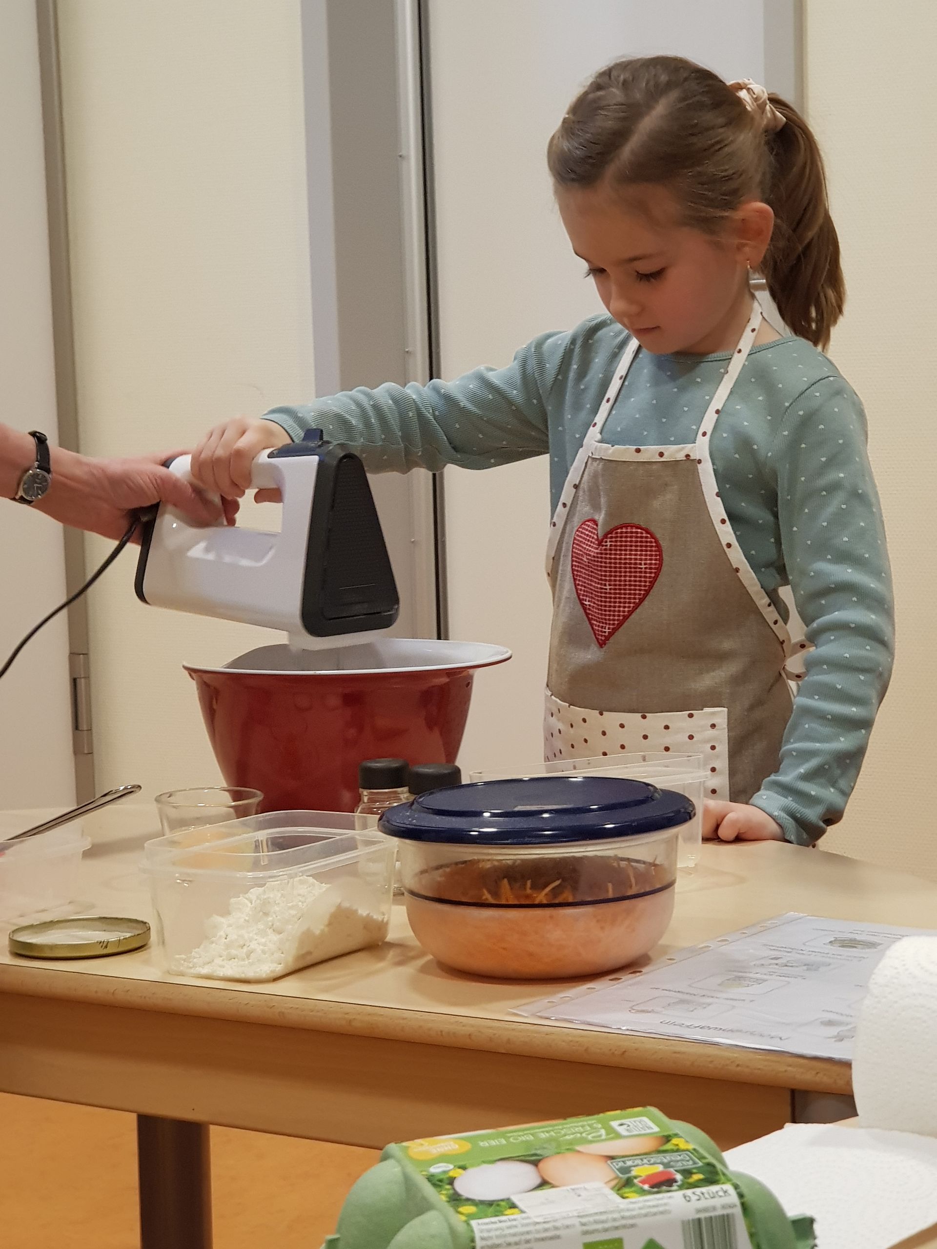 Außerdem gestalteten sie ihre eigenen Gemüsegesichter-Brote, machten selbst Müsli und Obstsalat, mixten einen Obstsmoothie und backten Karottenwaffeln. Natürlich wurde auch alles probiert und die Kinder fanden das selbst gemachte Essen und Trinken sehr lecker. Am Ende bekamen die Kinder dann alle ihren Gemüseführerschein und einen kleinen Kochlöffel und waren sehr stolz darauf.