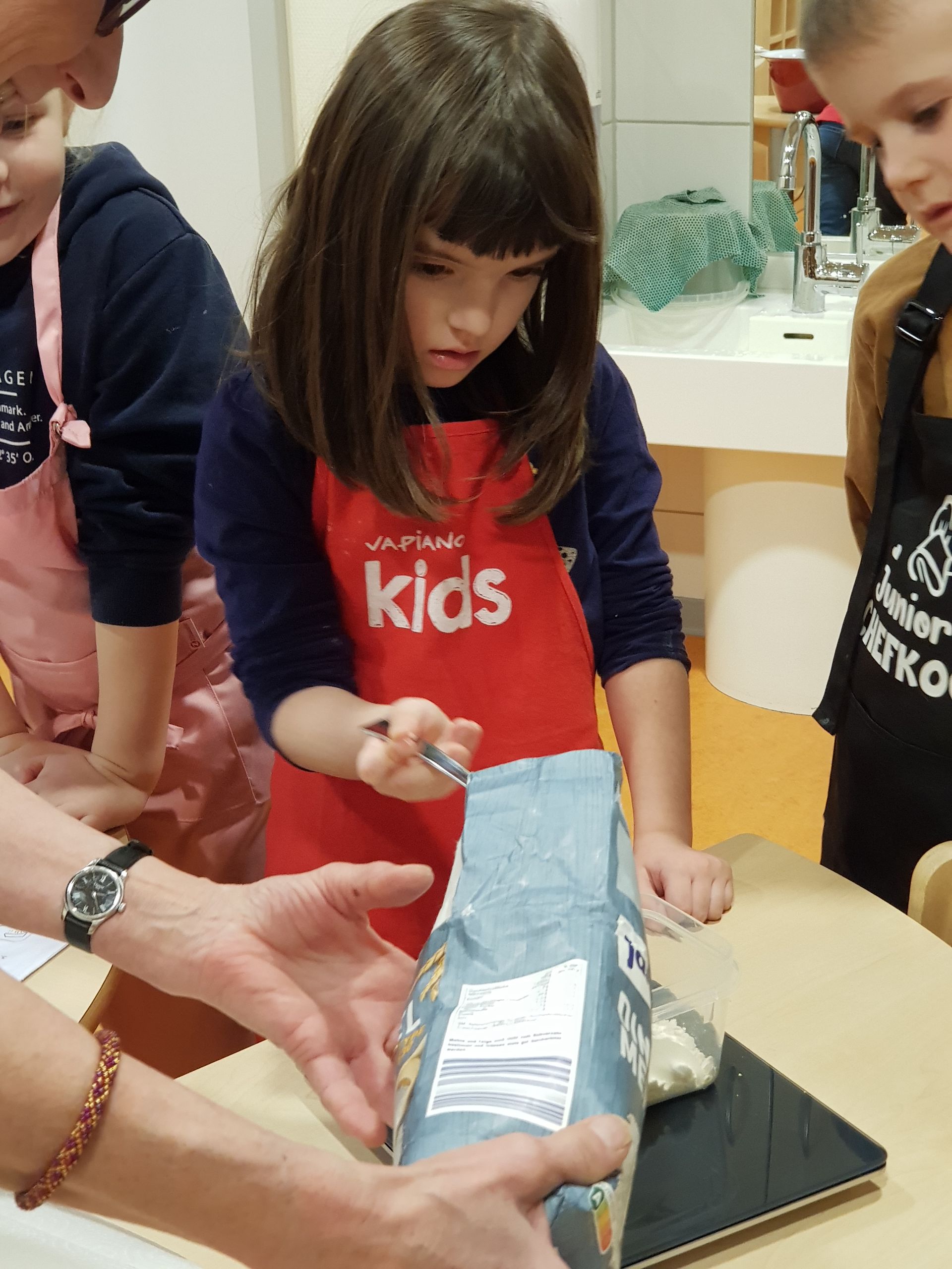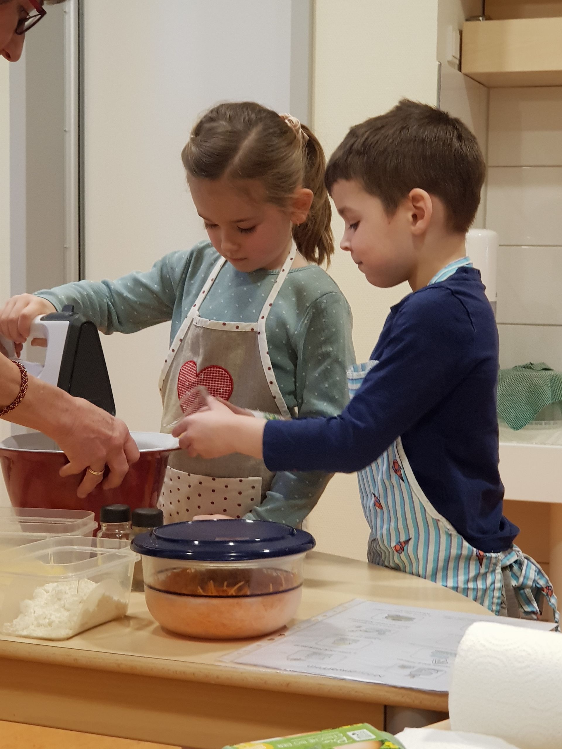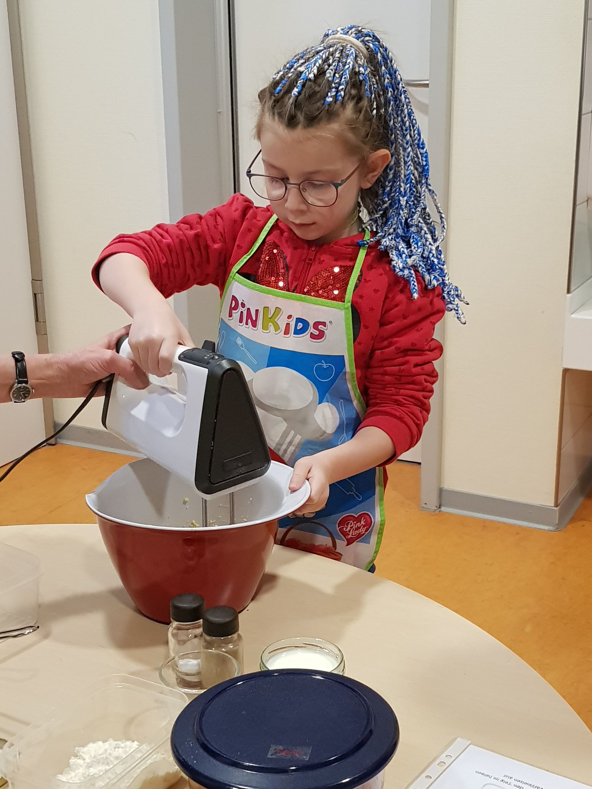 Außerdem gestalteten sie ihre eigenen Gemüsegesichter-Brote, machten selbst Müsli und Obstsalat, mixten einen Obstsmoothie und backten Karottenwaffeln. Natürlich wurde auch alles probiert und die Kinder fanden das selbst gemachte Essen und Trinken sehr lecker. Am Ende bekamen die Kinder dann alle ihren Gemüseführerschein und einen kleinen Kochlöffel und waren sehr stolz darauf.