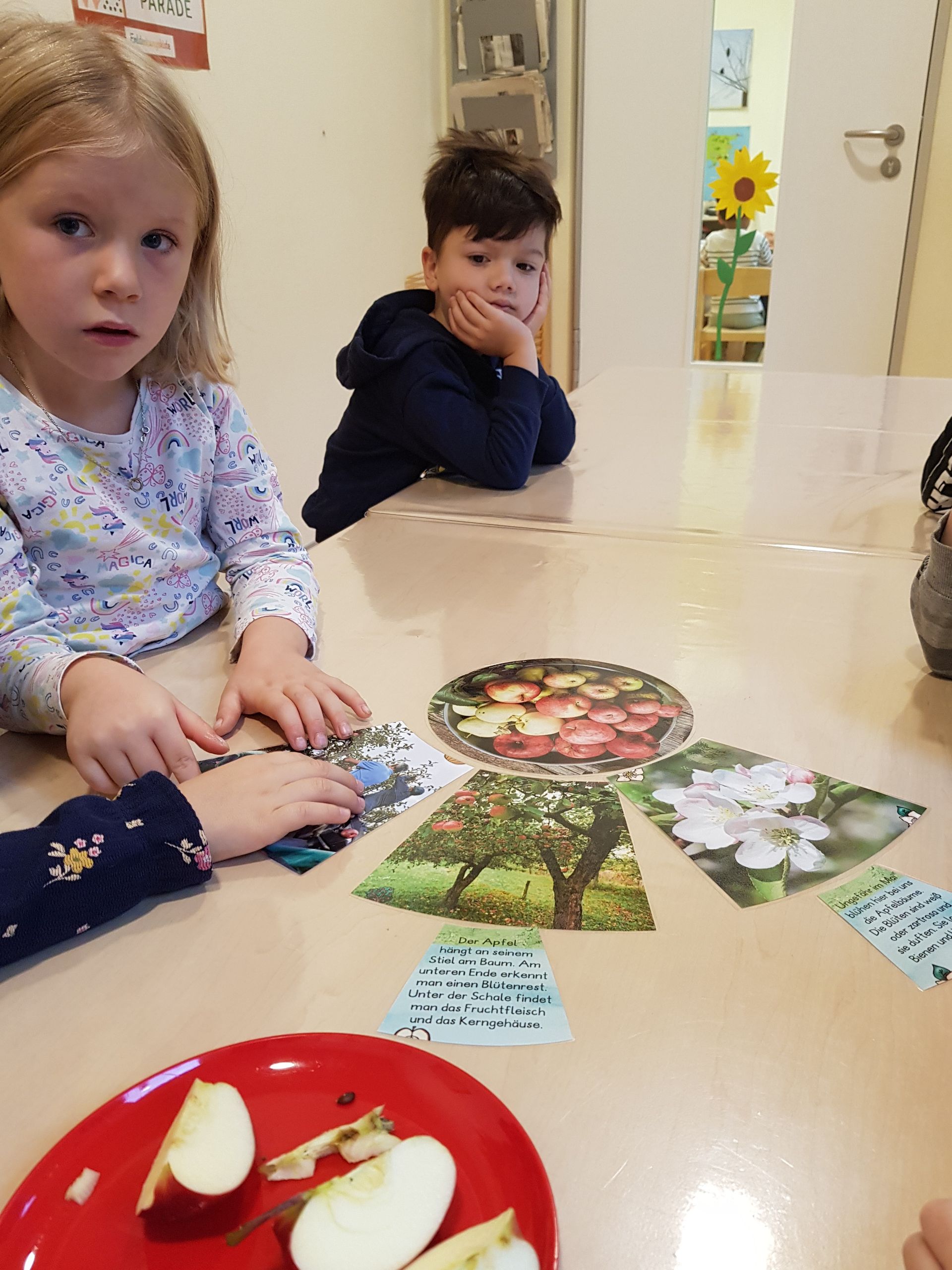 Zur Erntezeit haben sich die Vorschulkinder mit einer ihrer liebsten Obstsorten beschäftigt, dem Apfel. Bei einer Sachbetrachtung, dem gemeinsamen Besprechen eines Legekreises und verschiedenen Sachaufgaben zum Thema konnten die Kinder ihr Wissen vertiefen und erweitern.