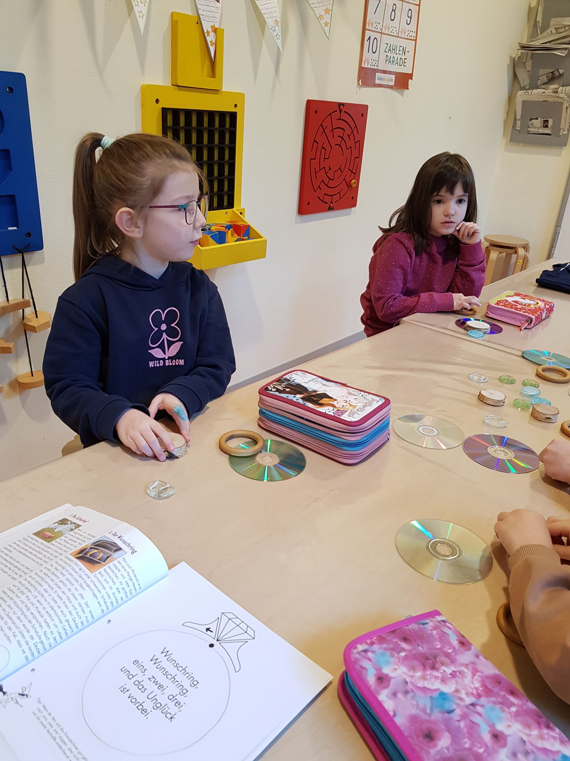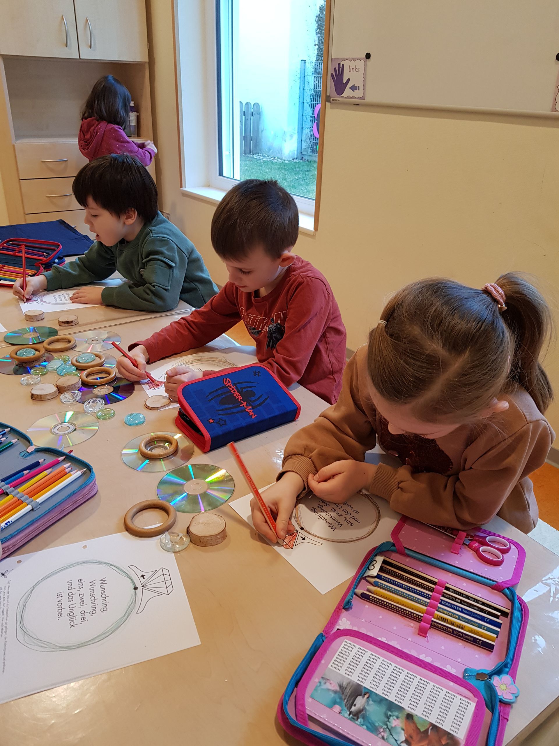 Die Vorschulkinder sind in ihr nächstes Projekt gestartet. Das Sprechzeichnen. Dabei gibt es in jeder Einheit eine Form, die die Kinder zunächst mit verschiedenen Materialien darstellen. Anschließend hören sie die Geschichte von Mira und Mirakula, den beiden Hexen. Die Kinder wiederholen den darin vorkommenden Zauberspruch. Der Reim wird dann mit dem Zeichnen verbunden. Dadurch ist Sprechzeichnen eine gute Grundlage für die spätere Schreibbewegung.