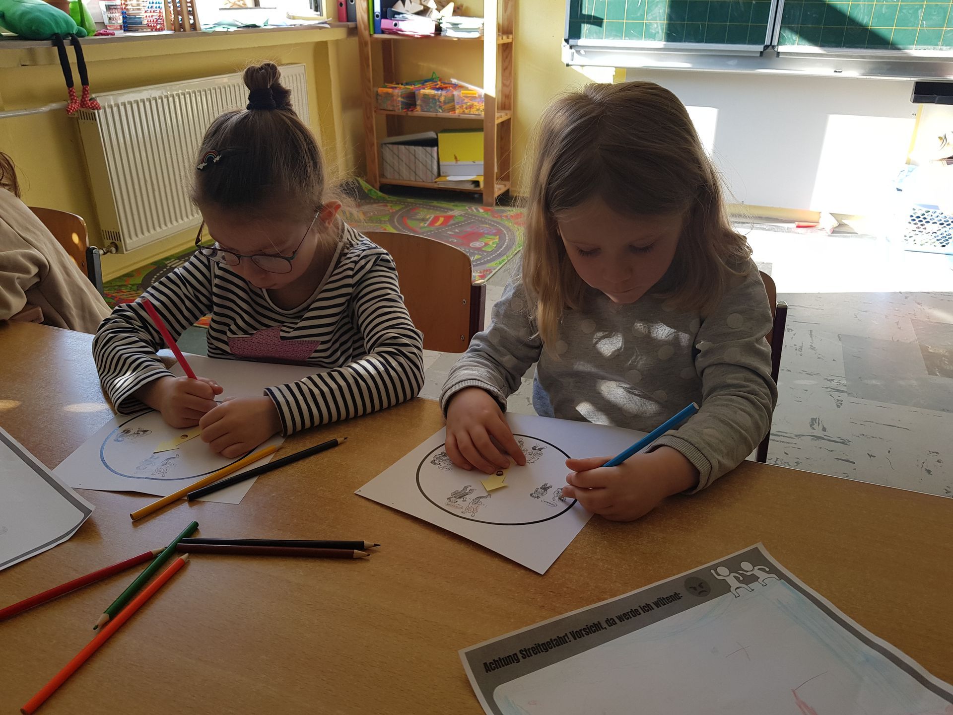 Unter diesem Motto trafen sich die Vorschulkinder mit den Kindern der 1. Klasse in der Grundschule. Das Kooperationsprojekt wurde von der Kita Sozialarbeiterin und der Schul- Sozialarbeiterin organisiert. An zwei Tagen lernten Kita- und Schulkinder gemeinsam, wie es überhaupt zu Streit kommt. Bei Gefühle-Pantomime konnten Emotionen erraten werden, es wurde eine Gefühle-Uhr gebastelt und überlegt, was man gegen Wut machen kann. So wurden den Kindern Strategien vermittelt, um in Konfliktsituationen eine gute Lösung zu finden und sich schließlich entschuldigen und vertragen können. Damit ein gutes gemeinsames Spielen, Arbeiten und Lernen gelingen kann wurden neue Strategien aufgezeigt und geübt.